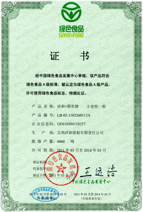 小麦特一粉绿色食品证书